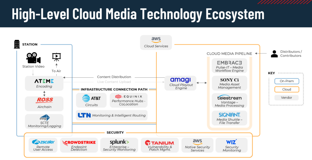 On the left side, live-to-air video is transmitted from the TV station (the “ground”) to the cloud. Examples of live-to-air video include news control room feeds for the daily newscast, network feeds from each market, and local programming feeds that go directly on-air.
