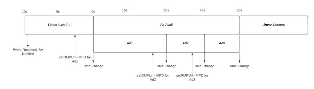 The receiver section covered the case of a single ad, but as noted above, there can be multiple ads in a single block, particularly if breaks are being signaled as one large break. Luckily, this is handled through a slightly different usage of the SetRMPURL API. Rather than setting the rmpSyncTime to nothing or a specific time, it can instead be set to -1.0, which tells the receiver to execute the action upon completion of the current media presentation. Only one call can be queued at a time, however, so it is important to wait until the preceding presentation has begun before calling the next startRmp. This is achieved using the time change notification mentioned earlier, as it triggers just as easily going between ad presentations, as it does going from program to ad and back. The sequence of events can be seen in Figure 9.