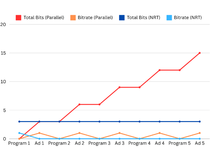First, if an ad is going to be reused, it is sent multiple times, once in each break. In the first airing, it requires the same number of bits as a Non-Real Time (NRT) solution. However, each subsequent break will double, then triple etc. the number of bits required by the parallel solution. The receiver could cache the ads after they’re received, but that loses the timing advantage over the NRT solution.