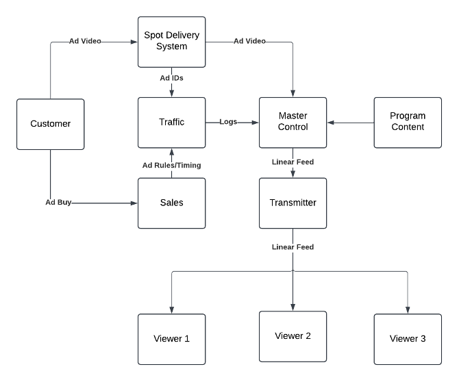 Dynamic Ad Insertion (DAI) is a well-known concept, but this section will seek to familiarize the reader with the basics, as well as why it is relevant to a broadcaster. In a traditional linear ad sales model (depicted in Figure 1), ads are sold ahead of time in varying categories, which establishes a set of rules on what ads need to be aired at what time, in what order, and next to what content or ads. These rules are then used by the broadcaster’s traffic department to assemble the advertising logs for each day, normally set out the day before. This results in a fairly static set of spots, though programming variances on live shows can sometimes cause more or fewer spots to be aired than planned. These variances are in turn often handled by a series of rules, with replacement spot or spots cutting priority being laid out in advance, though some broadcasters, particularly cable sports broadcasters, have been known to simply provide the dollar value of each spot in the logs to allow the operator to make rapid judgments in the moment. Regardless of this, each spot is sold on and shown to all viewers, with some exceptions as noted below.