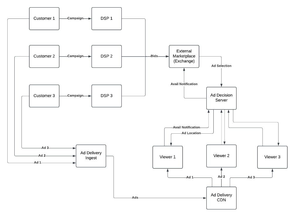 In this method, depicted in Figure 2, the stream contains an indicator of when an ad is available. These can take many forms, and some will be explored in the next section. Regardless of method, it allows the client, generally controlled by the streamer, to determine when an avail begins and ends. When this information is received, the application, be it a website or native app, reaches out to the ad server to request an ad, generally giving information on the viewer, the avail location, and the duration. The server in turn offers the block up on an ad exchange. The Demand Side Platforms (DSP) contain the rules for airing the ad, the advertiser’s budget for the campaign, and the ad content and metadata. The DSP uses this information to place bids for the block.