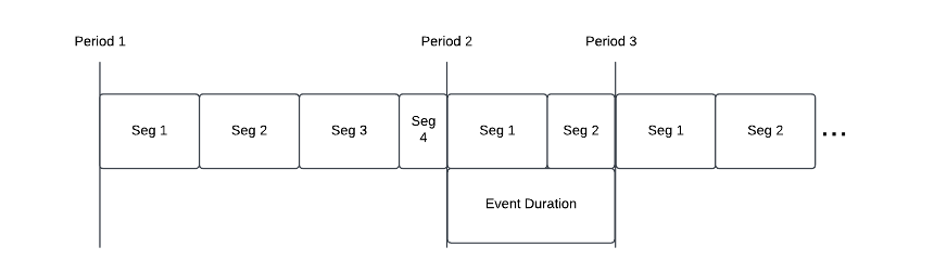 For ad insertion, the receiver needs enough time to buffer the ad media before the break to ensure a smooth and frame-accurate transition in and out of the inserted ad. MPD-based events are therefore easier to execute in this situation. To achieve this, the encoder doing the DASH packaging must read the SCTE markers on the input, noting the time on each one to ensure the time is maintained relative to the new DASH timeline. It must then splice the segment at the indicated time and generate a new period with a new timeline beginning with the second half of the spliced segment. This ensures a complete Group of Pictures (GOP) at the start of each Period, which is critical to allowing the player to switch between two distinct streams with no interruptions. Without this, it would need to wait for the next I-frame when resuming the live broadcast after an ad, which would lead to some amount of black video. Figure 6 shows an example of segment splicing for event periods.