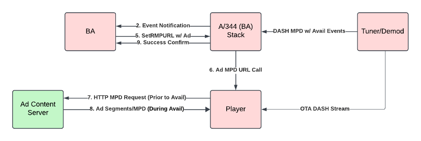 In this method, the broadcaster plays an ad via the BA at a specific time via the Application Media Player (AMP). This is the least elegant of the options described here, as the timing is virtually impossible to align due to the varying nature of reception. Receiver-side delays, such as different player implementations and segment reception times, coupled with delays in the airchain, mean receivers will generally be off by at least several seconds from each other.