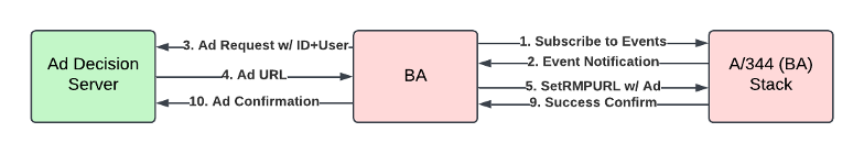 When the BA launches via the HELD upon the user selecting the relevant service, the first thing it must do is subscribe to the relevant notifications: events and RMP media time changes, both described above. It should also query the device info to retrieve the two relevant IDs to reduce the delay when it comes time to request an ad from the decision server (see Figure 8). With these tasks accomplished, it can then wait for an event to come through.